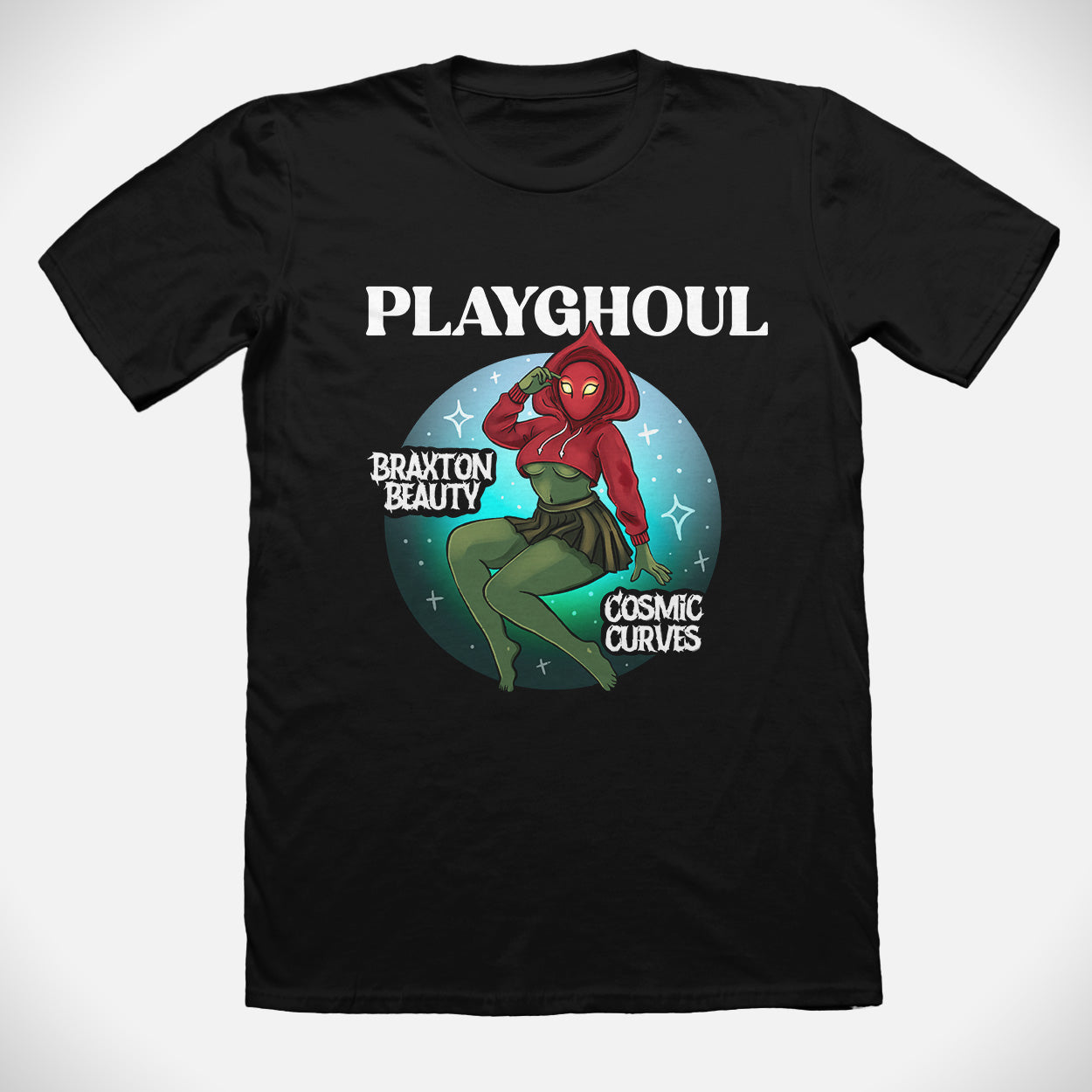 A cosmic pin up design that blends spooky charm with out of this world style.