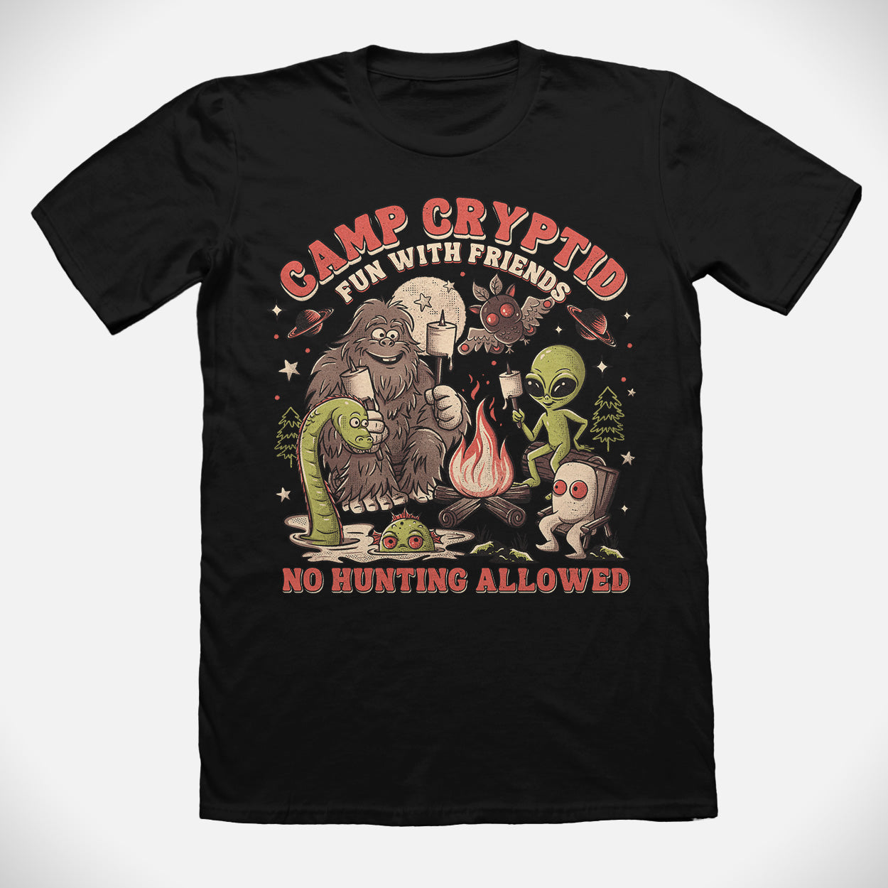 Gather ‘round the fire with Bigfoot, aliens, and cryptid friends — the Camp Cryptid Tee is all about fun (no hunting allowed)!