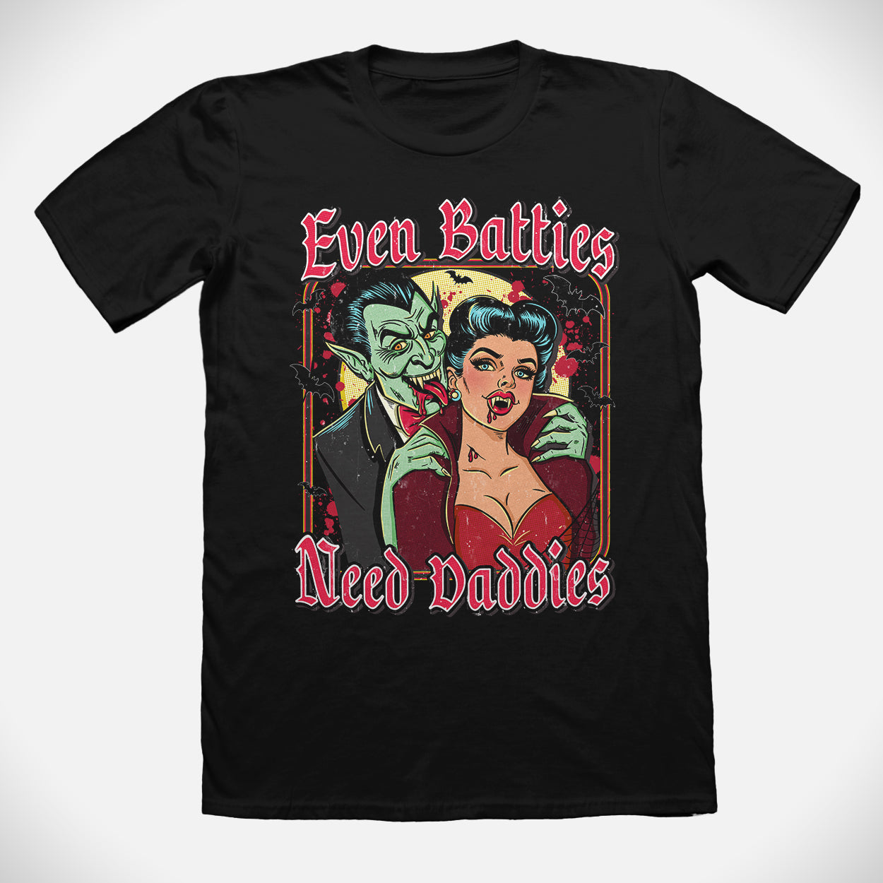 Retro pin-up meets vampire vibes in this cheeky graphic tee, perfect for horror lovers with a dark sense of humor.