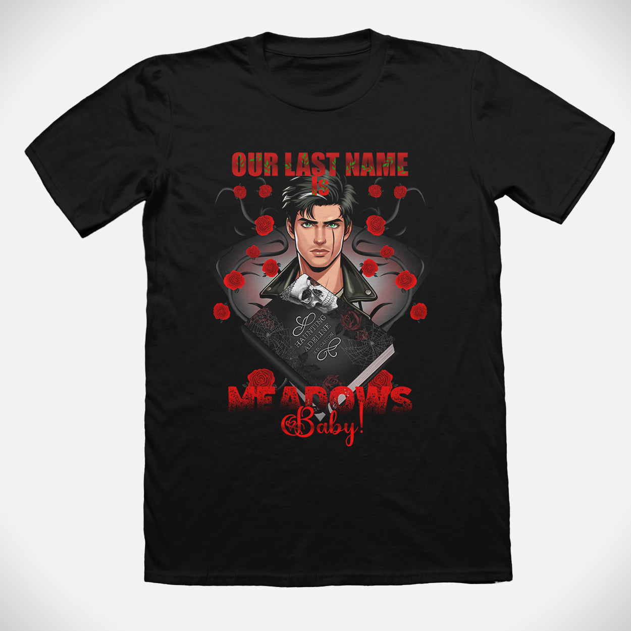 Show off your bookish obsession with this bold “Our Last Name is Meadows, Baby!” tee, featuring striking art inspired by dark romance vibes.