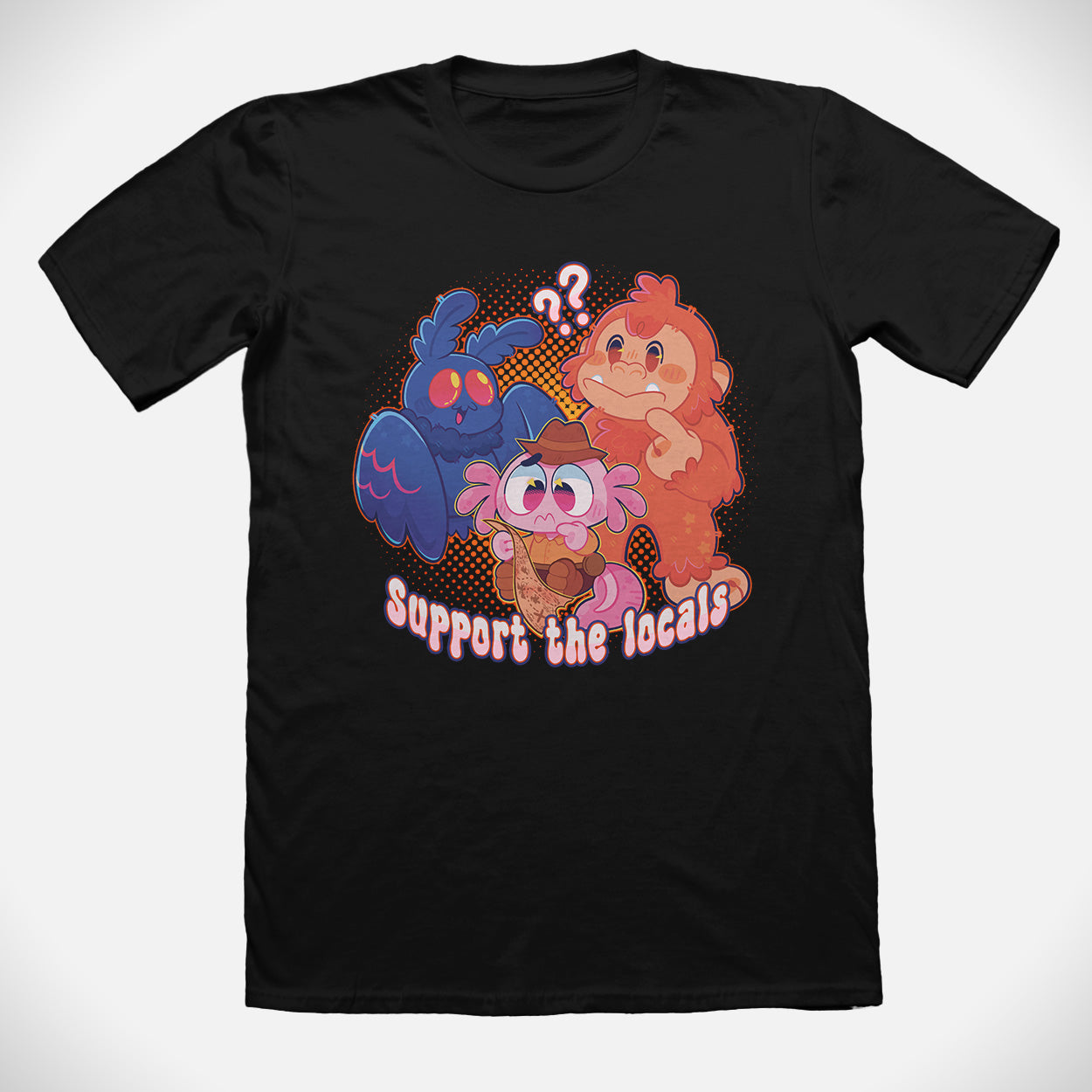 Show love for your favorite cryptids with the Support the Locals Tee — featuring Bigfoot, Mothman, and Melvin the axolotl adventurer.
